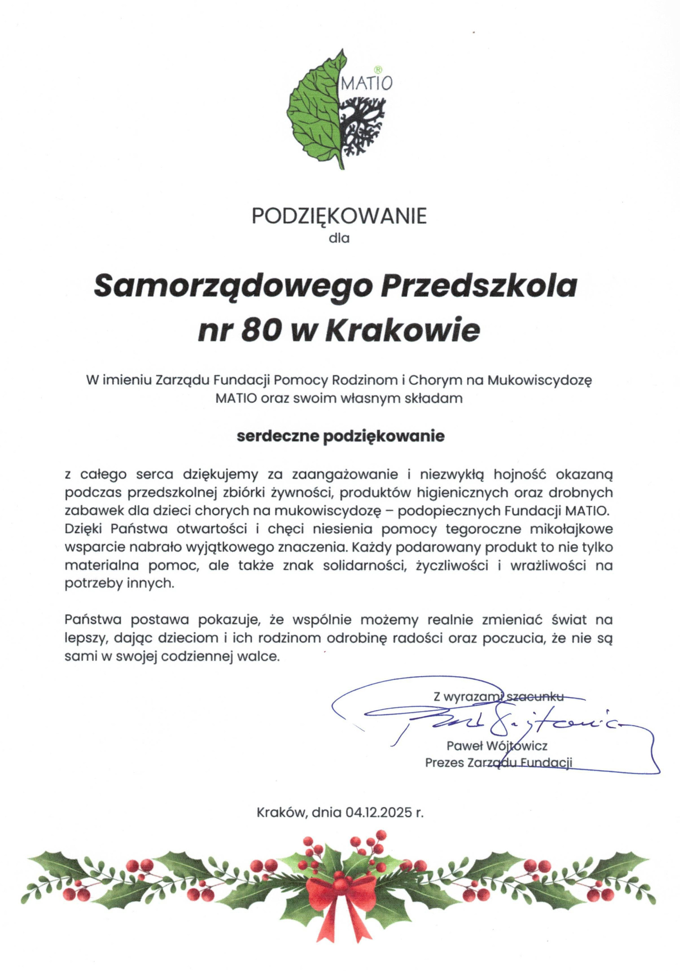 09.12.2025 09:45Serdecznie dziekujemy za zaangażowanie wszytskim Rodzicom i dzieciom w akcję charytatywną Mikołaj dla Mukolinka dla dzeci z mukowiscydozą! Cieszzymy sie, że choć małym gestem możemy sprawić trochę uśmiechu na twarzach dzieci!